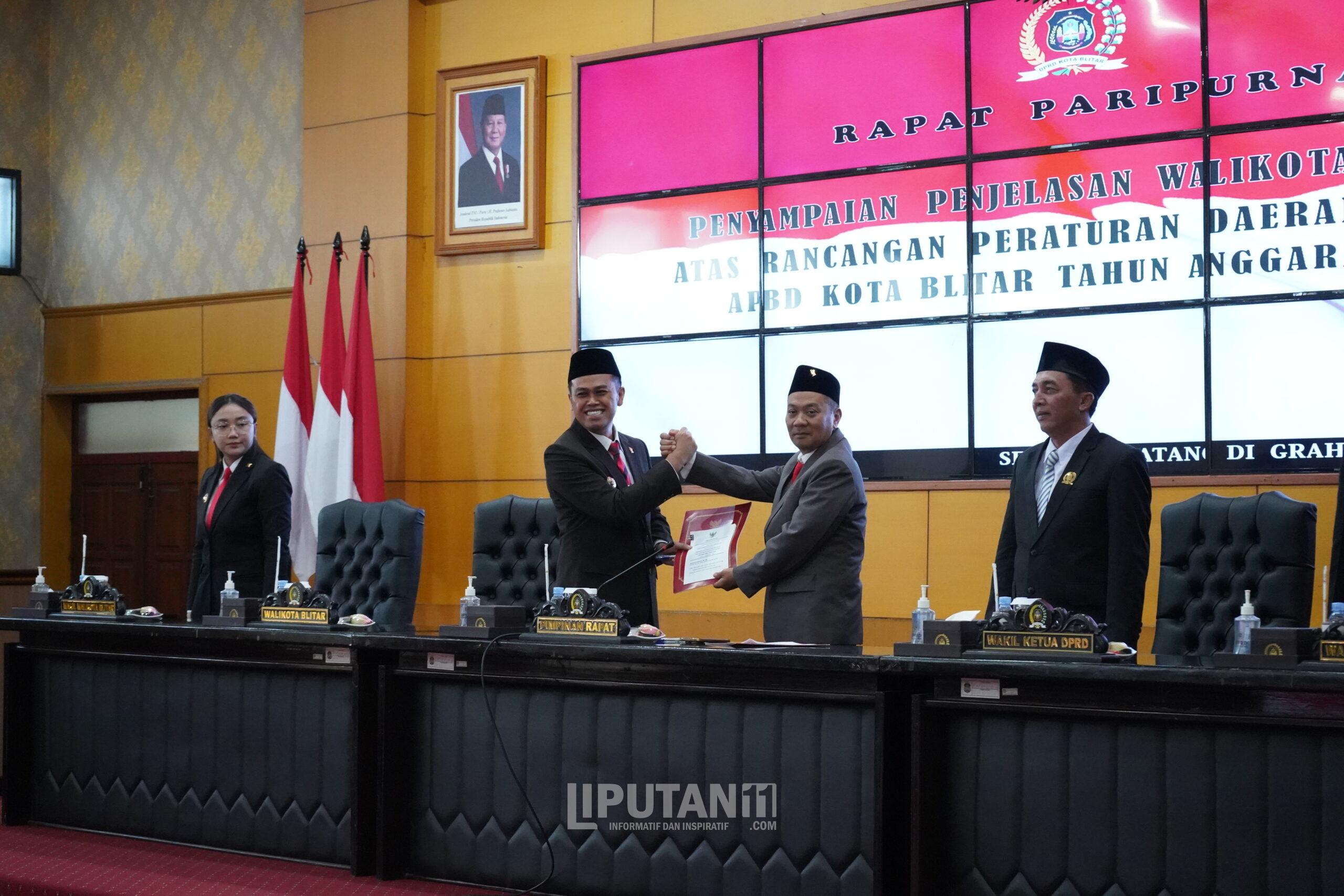 Rapat Paripurna ditutup dengan penyerahan dokumen Raperda APBD Kota Blitar Tahun Anggaran 2026 dari Wali Kota kepada Ketua DPRD sebagai simbol dimulainya proses pembahasan bersama antara pihak eksekutif dan legislatif.