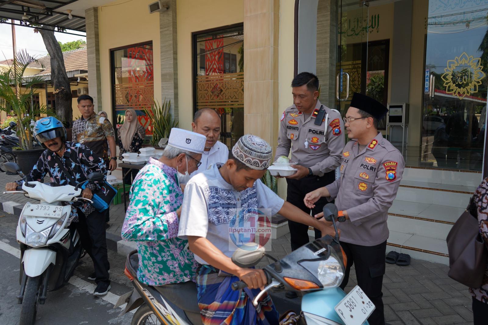 Liputan11SITUBONDO – Suasana khidmat usai pelaksanaan ibadah salat Jumat di Masjid Al Asykar Polres Situbondo mendadak berubah hangat. Hal ini terjadi saat Kapolres Situbondo, AKBP Bayu Anuwar Sidiqie, S.H., S.I.K., M.Sc., turun langsung menyapa jamaah sambil membagikan ratusan paket nasi kotak pada Jumat (10/4/2026).
