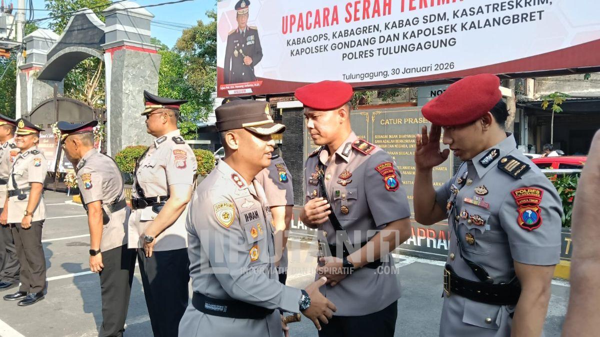 Tulungagung – liputan11.com, Kapolres Tulungagung AKBP Dr. Ihram Kustarto, SH, SIK, MSi, MH, pimpin upacara serah terima jabatan beberapa PJU dan dua Kapolsek. Upacara berlangsung di halaman Mapolres Tulungagung, Jumat (30/1/2026).