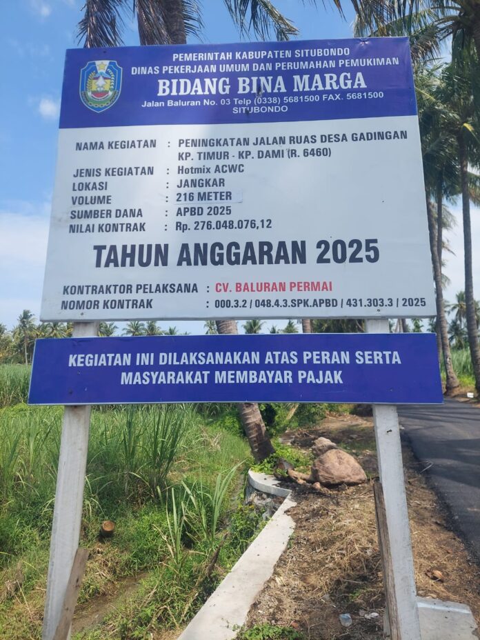 Proyek peningkatan jalan pada ruas Kp. Timur – Kp. Dami, Desa Gadingan, Kecamatan Jangkar, Kabupaten Situbondo, senilai Rp 276.048.076,00 menjadi sorotan tajam dan menuai kritik keras dari masyarakat setempat. Proyek yang dikerjakan oleh CV. BALURAN PERMAI di bawah pengawasan Dinas Pekerjaan Umum dan Perumahan Permukiman (PUPP) Bidang Bina Marga Situbondo ini dituding memiliki kualitas yang sangat buruk dan dikerjakan secara asal-asalan.