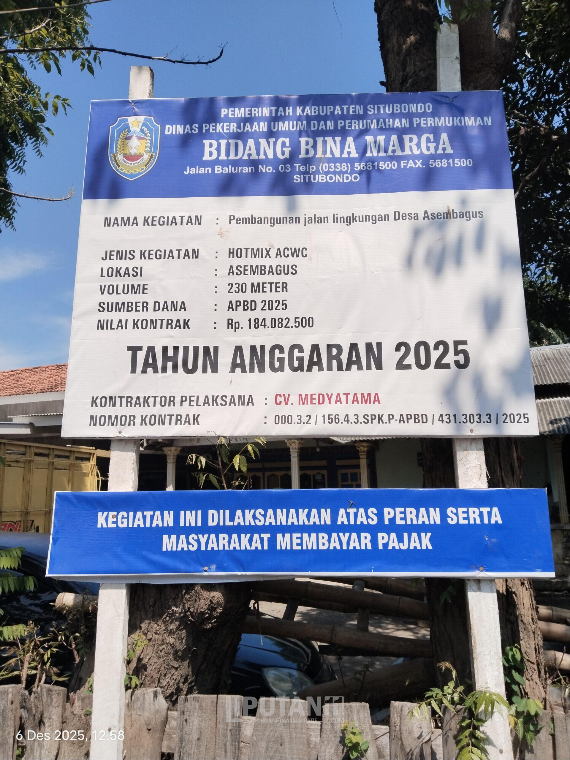 Liputan11SITUBONDO, JAWA TIMUR – “Kinclong” aspal yang memukau di proyek jalan lingkungan Desa Asembagus, Kecamatan Asembagus, Situbondo, kini menjadi sorotan tajam. Alih-alih membanggakan, kemulusan jalan hotmix yang menelan anggaran APBD 2025 sebesar Rp 184.082.500 ini justru mengisyaratkan adanya praktik yang merugikan negara. Warga menduga, keindahan jalan tersebut hanyalah “topeng” yang menutupi dugaan korupsi.